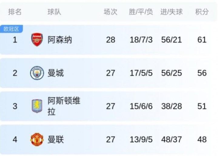 4 - 德转统计英超第19轮以来拿分榜:阿森纳19分居首,曼联16分第三
