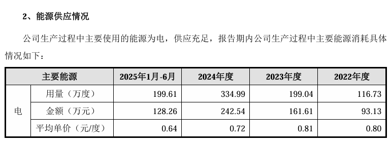 此外,环评文献透露2024年公司的审批耗电量为600万度,而招股书流露同期实质用电量仅334.99万度。同期,环评文献基于600万度的现存用电量,测算募投模样新增用电量530万度,投产后总用电量达1130万度;若以招股书334.99万度简直切用电量计较,投产后用电量将是现存水平的3.37倍,与仅新增7.5%的产能极不匹配。