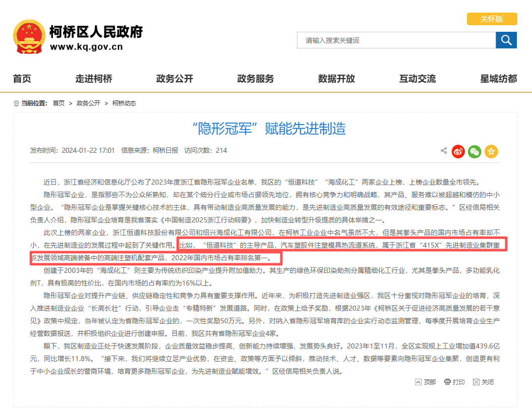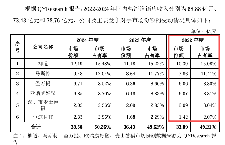 据柯桥区东说念主民政府官网2024年1月转载的《“隐形冠军”赋能先进制造》一细腻确说起,恒说念科技主导居品汽车塑胶件注塑模具热流说念系统,2022年国内市集占有率排行第一。但矛盾的是,公司在第二轮审核问询函回话中透露,笔据QYResearch汇报,2022年恒说念科技市集占有率仅为2.07%,行业排行第六,与前述报说念存在显著相反。至于其原因,公司并未继承记者采访。