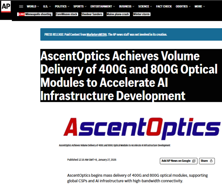 【环球网财经概述报谈】据好意思联社音书,光学通讯措置决策向上提供商AscentOptics认真文告,其400G和800G光模块产物线已到手插足大边界分娩阶段,并正在向公共多个地区的云就业提供商(CSP)进行批量托付。这一举措得志了日益增长的东谈主工智能和云计较基础递次对高带宽谋划的紧迫需求,标识着公司在高速光互连时刻及公共供应链托付智商上迈出了关节一步。