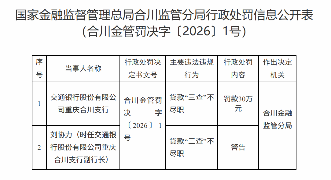 2月2日,国度金融监督解决总局合川监管分局行政处罚信息公开表流露,BG真人(BigGaming)官方网站北京pk10交通银行股份有限公司重庆合川支行因贷款“三查”不守法被罚金30万元。株连东说念主刘某力被教授。