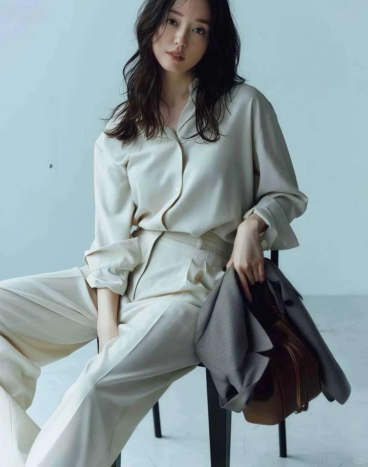 许多姐妹误以为遮肉就得穿大一号,但H型套装的精髓在于“称身但不贴身”,肩线落在你肩膀的正上方,袖子不紧贴手臂但也不空荡,裤管和腿之间保留拳头摆布的余量就够了。