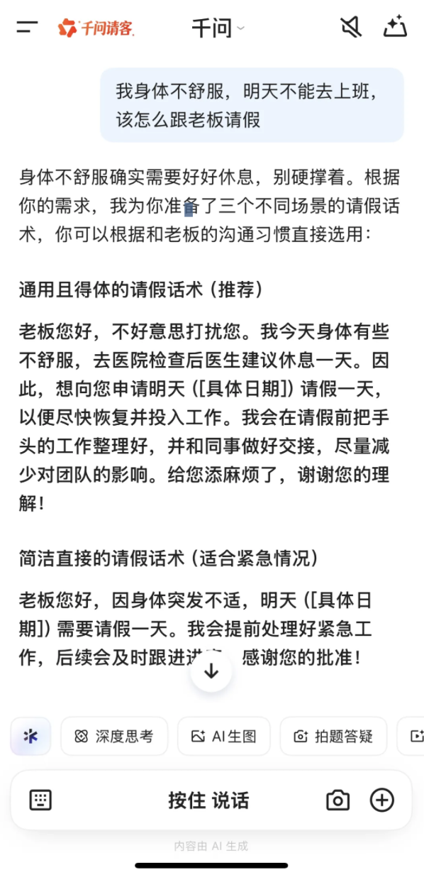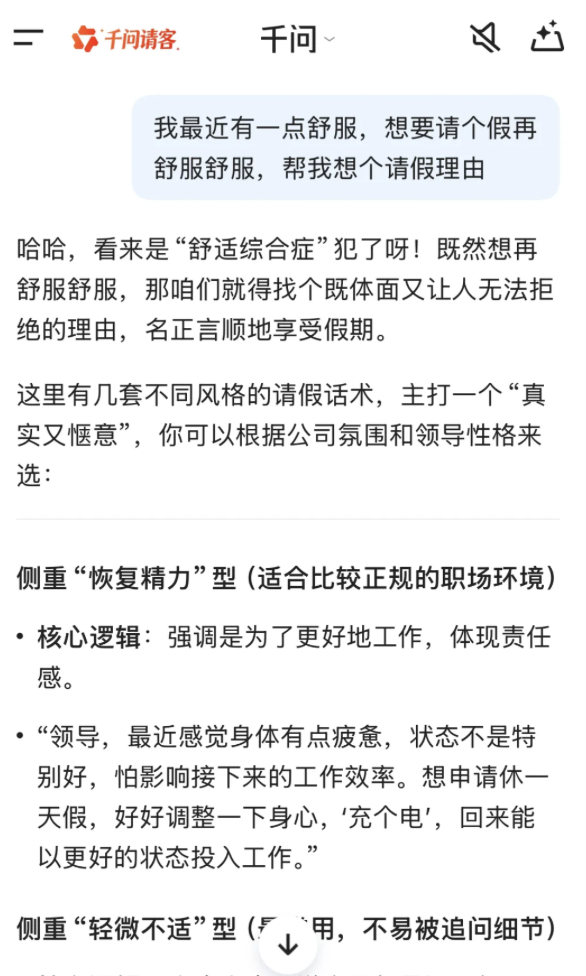 据悉,天然今天开工大吉,但让“千问帮我”写请假条的东说念主数激增530%。有的东说念主主打正式其事,用“体魄不惬意,百家乐帮我请个假”这种请示词找千问编请假条,根由包括但不限于拔牙、甲沟炎、痔疮手术、跑肚、踢到金莲趾。