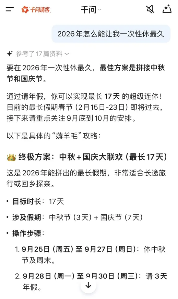对此,千问的冷落是这些一又友不错收收心,逐渐诊疗回责任状况。天然若是真实不念念上班,也不错将中秋、国庆假期和年假凑一凑,构成17天的“拼好假”。