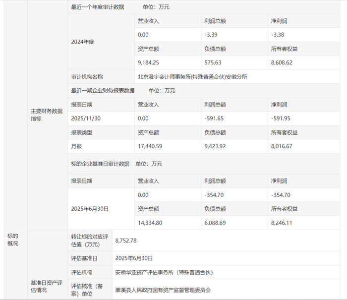 财务数据显示,截至2025年11月30日,濉溪深科置业未实现盈利且企业营收为零。同期该公司资产总额17,440.59,负债总额9,423.92万元,较2024年度分别增加8256.34万元、8848.29万元,较2024年度增幅分别为89.89%、1537%。截至2025年6月30日,转让标的濉溪深科置业对应评估值8,752.78万元。