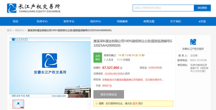 近日,据长江产权交易所消息,濉溪深科置业有限公司(简称“濉溪深科置业”)100%股权挂牌转让,转让方为濉溪县畅享公共租赁住房运营有限公司,挂牌价87,527,800元,挂牌起止时间为2025年12月31至2026年2月11日。