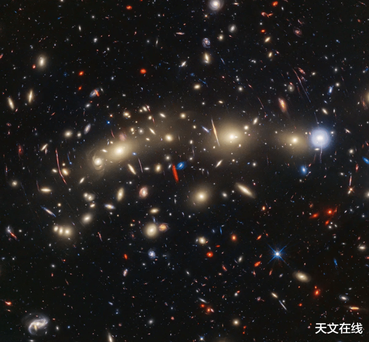 由詹姆斯韦布空间望远镜和哈勃空间望远镜拍摄的圣诞树星系团MACS0416。点击图片可放大查看。图片来源:美国国家航空航天局(NASA)、欧洲航天局(ESA)、加拿大航天局(CSA)、太空望远镜科学研究所(STScI)、何塞M迭戈(IFCA)、乔丹CJ达席尔瓦(西澳大学)、安东M库科莫尔(太空望远镜科学研究所)、杰克萨默斯(亚利桑那州立大学)、罗吉尔温德霍斯特(亚利桑那州立大学)、闫浩靖(密苏里大学)