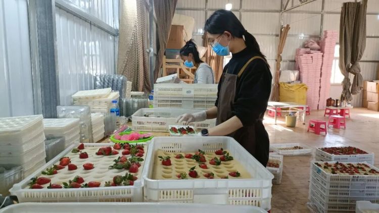 工东谈主正在分选包装黑草莓。杨茜 摄