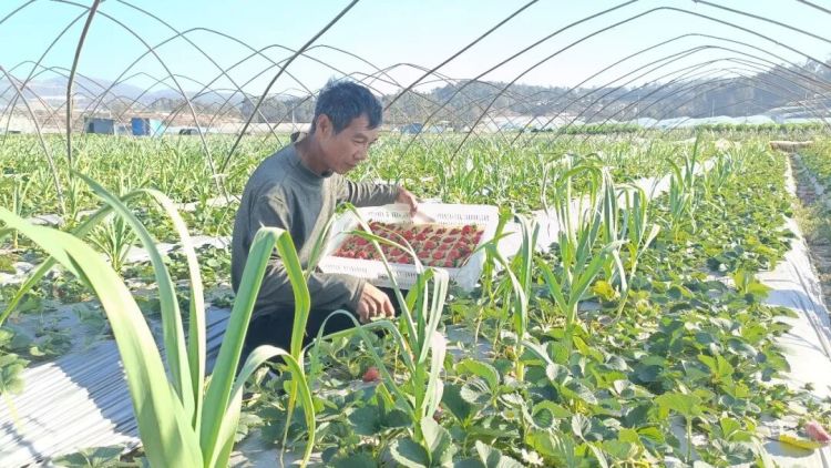 培植户周鹏振手里拿着粉草莓、黑草莓。李春丽 摄