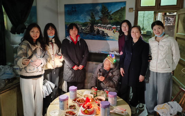 3月30日,社区责任主谈主员到曹胜亭家里为其庆生