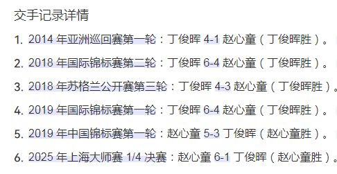 丁俊晖在两边前4次交手一都告捷,随后遭受了两连败。两东说念主最近一次交手发生在客岁的上海大众赛,那时赵心童以6-1征服丁俊晖。