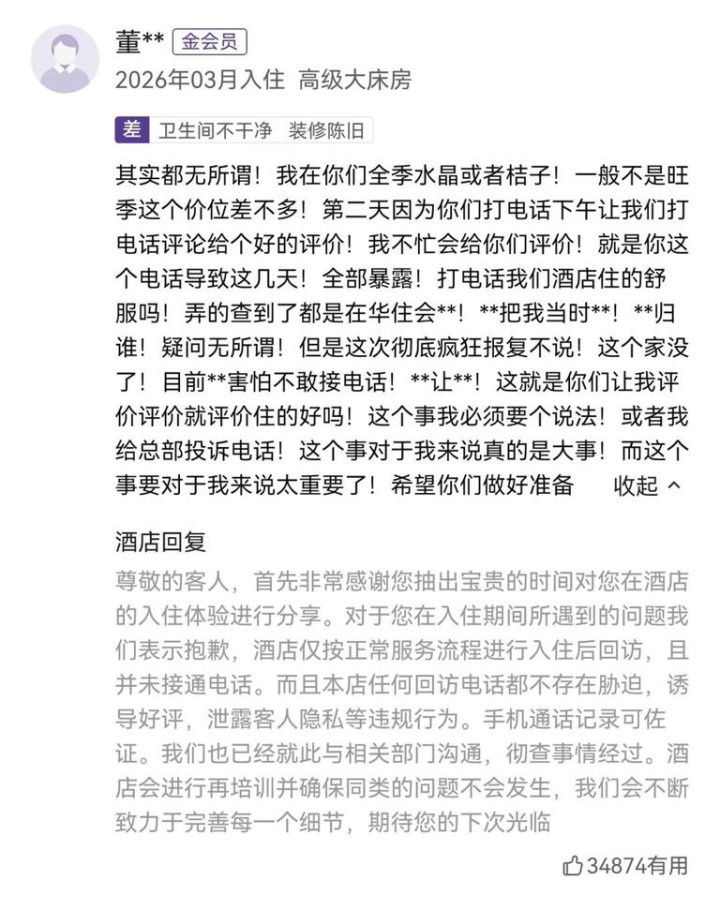 网传差评来自华住会APP上的“山西大同政务大厅万达广场桔子水晶旅店”。发布者疑为一董姓忽地者。这名会员在指摘中说,我方2026年3月入住该旅店后,第二天接到了旅店的回拜电话,恰是这通电话,让我方的行程“一谈暴露”,并激发了严重的家庭纠纷,最终导致“家庭翻脸。”