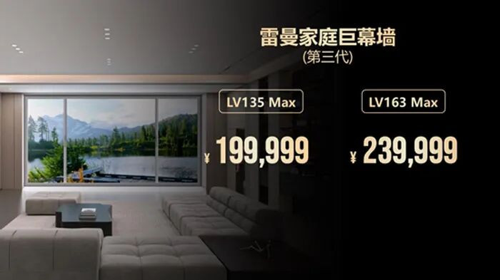 而几乎在同时,雷曼光电发布采用Micro LED直显技术的新一代家庭巨幕LV135 Max(135英寸、4K)与LV163 Max(163英寸、4K)两款新品,定价分别为19.9999万元和23.9999万元,产品定价较上一代产品下降超过一半。