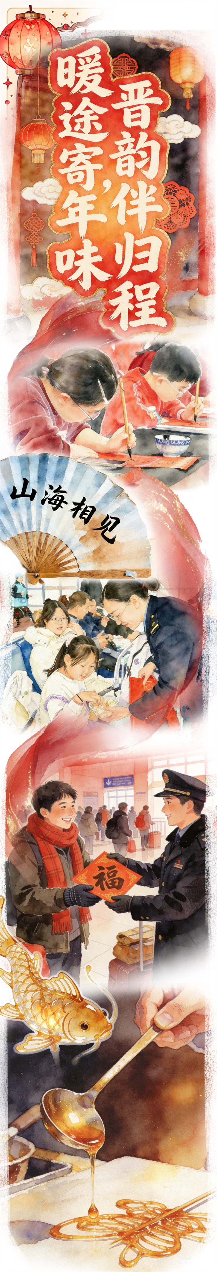 车站是春运的起原,更是怜惜的港湾。在山西多个车站,归乡路充满了年味与应承。原平站里,“小书道家”们稚嫩的小手持着羊毫,一笔一画书写着对联与祝贺,文字书香拆除了候车的困窘;朔州东站里,剪纸艺东谈主指尖翻飞,一张张窗花灵动水灵,将浓浓的年味儿,刻进每一位搭客的心底;平遥古城站里,铁路员工亲手为中外搭客写下“福”字,让中国的年味传递出杰出山海的善意与怜惜。