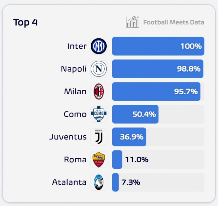 直播吧4月9日讯意甲第31轮比赛之后,开云官方体育app国米以7分的上风领跑积分榜。足球数据分析机构FootballMeetsData对各队过问前4的概率进行了展望,国米、那不勒斯和米兰基本信赖前四位置,北京pk10官网科莫50.4%,尤文36.9%,罗马仅有11%。