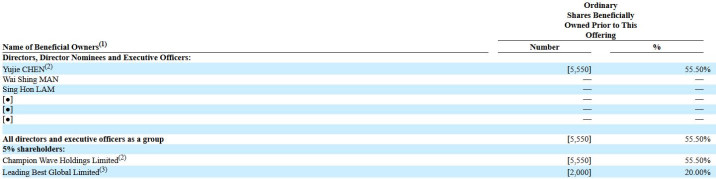 IPO前,Yujie CHEN持股55.5%,Tak Wai, CHU持股20%。
