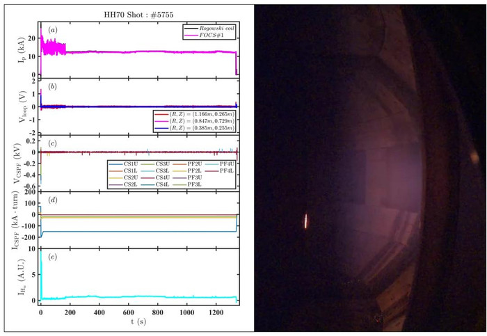 “洪荒70”是由能量奇点研发建造的全球首台全高温超导托卡马克装置,国产化率超过96%。此前,“洪荒70”进行了基于局部螺旋磁通注入(电子枪)和离子回旋加热(ICRF)两种预电离方式的放电实验,并成功获得第一等离子体。“洪荒70”高温超导托卡马克的中心场强0.6特斯拉,等离子体大半径0.75米,其磁体系统由26个高温超导磁体构成。