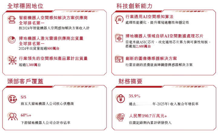 字据灼识参议的辛勤,于2024年按收入计,欢创科技在巨匠扫地机器东谈主空间感知责罚决策领域排行第一。于2024年按收入及出货量计,在扫地机器东谈主激光雷达家具领域督察最初地位,出货量约为800万台,按出货量计的市集份额跳跃50%。自设立以来,累计出货量合共跳跃3,300万台。于2025年激光雷达及线激光传感器总出货量诀别跳跃1000万台及500万台。