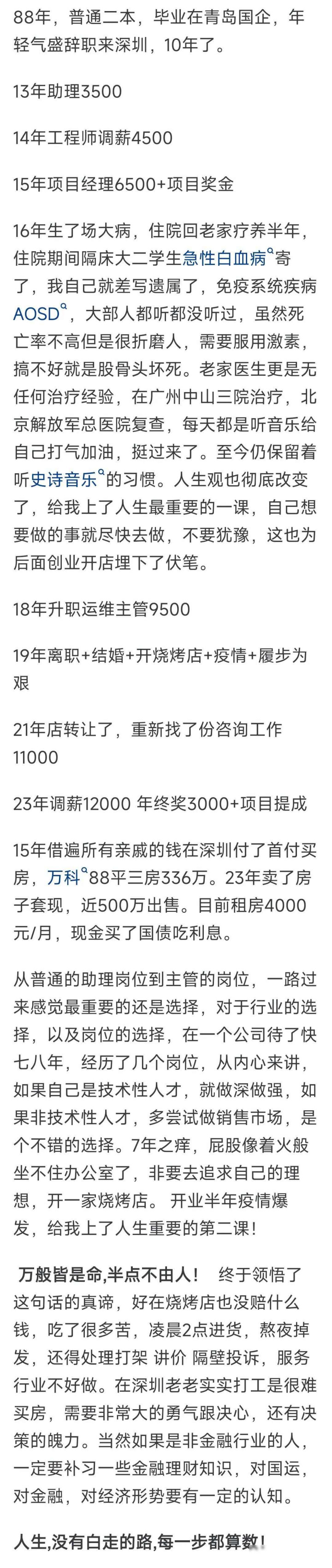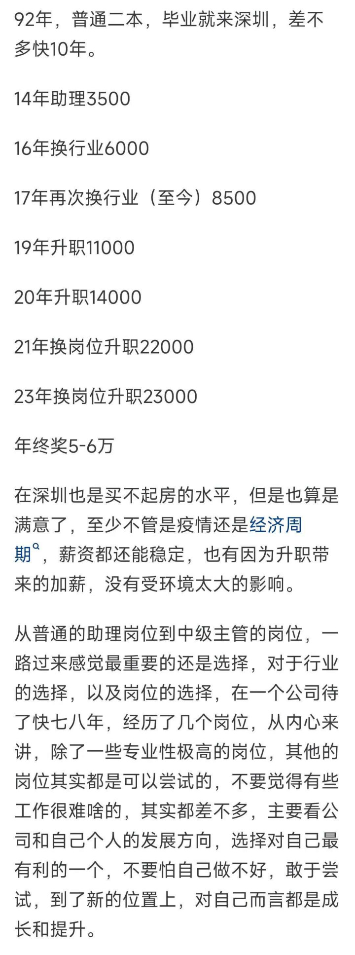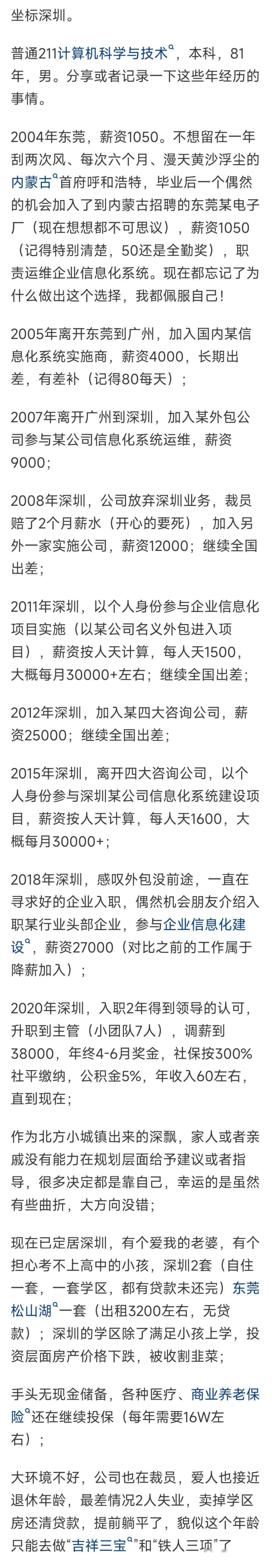 这位通讯工程师2008年毕业,刚责任时每月拿八千块,干了四年工资升到一万六,2015年转行作念东说念主工智能,月薪一下子涨到两万六,他运说念可以,2020年被调到业务岗亭,年薪径直冲到一百八十万,第二年又涨到三百万,但2022年商场遇冷,收入掉回两百二十万,2023年他决定去职分工,本年瞻望能分到八十万,他的发展阶梯看起来像坐火箭,其实每一步齐踩在行业风口上,换赛说念、转岗亭、拿股权,少通常齐难有这得益。