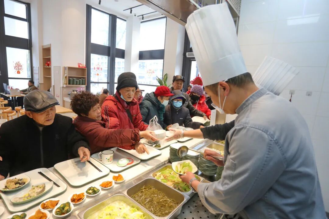 1月6日,在嘉兴市南湖区南湖街说念南湖社区幸福食堂鸳湖小馆内,老东说念主们正在列队选餐。图源:潮新闻客户端