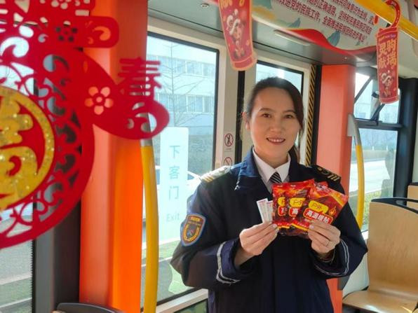 “新年餍足,迎接乘坐青岛有轨电车。”轨说念巴士乘务员泮茜茜已是第五个春节苦守在岗亭上。本年,隆重的她提前用中国结、窗花隐敝车厢,让乘客一上车就感受到浓浓年味。