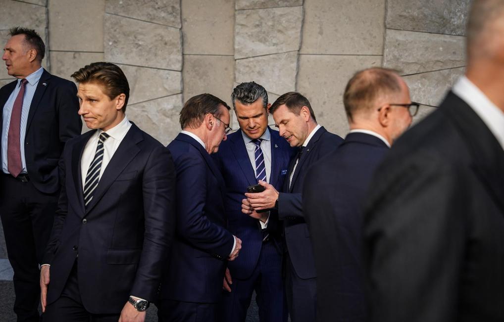 {jz:field.toptypename/}2025年10月15日,在比利时布鲁塞尔举行的北约防长会议截止后,好意思国国防部长赫格塞念念(中)与爱沙尼亚国防部长佩夫库尔(右三)、德国国防部长皮斯托里乌斯(左三)交谈。新华社记者彭子洋摄