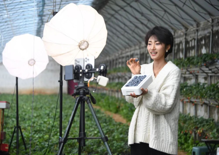 在北京市平谷区山东庄镇鱼子山村一处设施农业基地的大棚内,责任主谈主员直播销售蓝莓。新华社记者任超摄